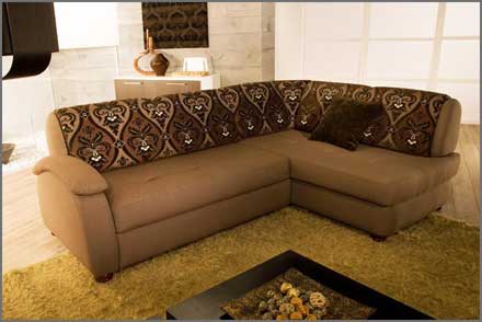Характер модели во многом определяется тканью. Угловой диван «Сидней» в белой искусственной коже и в ткани с крупным рисунком выглядят как два разных дивана. Механизм подъема оттоманки снабжен двумя пневмоцилинрами. Объем бельевого ящика – 285 литров.