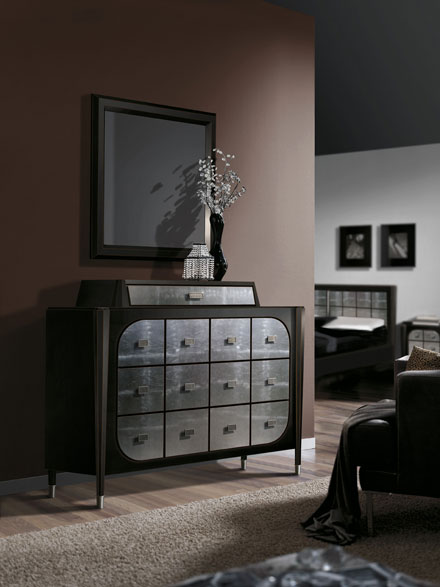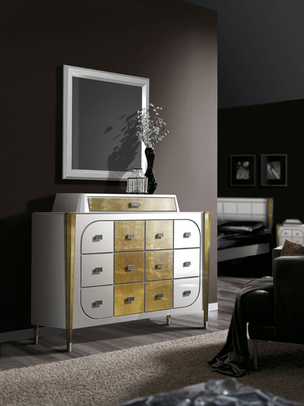Комод, серия «Винтаж», испанской фабрики Lino. Мебель может быть выполнена в черном и белом цвете. Ящики и пилястры могут быть шпонированы полисандром, покрыты сусальным золотом, серебром.